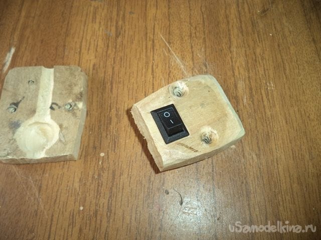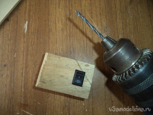 Чтобы контакты выключателя не мешались закрытию другой дощечкой, на другой дощечке делаем углубление с помощью толстого сверла в сантиметр в диаметре или больше на месте прикосновения контактов к дощечке при закрытии.
