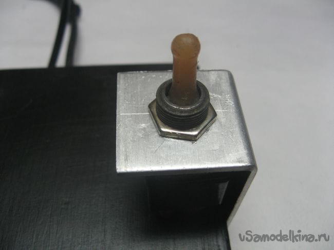 Продеваем провода в отверстие со стороны дна конструкции. Распаиваем выключатель, у меня это тумблер ТП 1-2. Уголок крепим к основанию. Прикручиваем к уголку тумблер. Если нет уголка как у меня и другой выключатель, то можно изготовить что-либо под свои нужды.