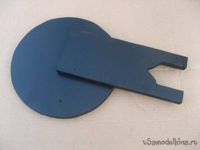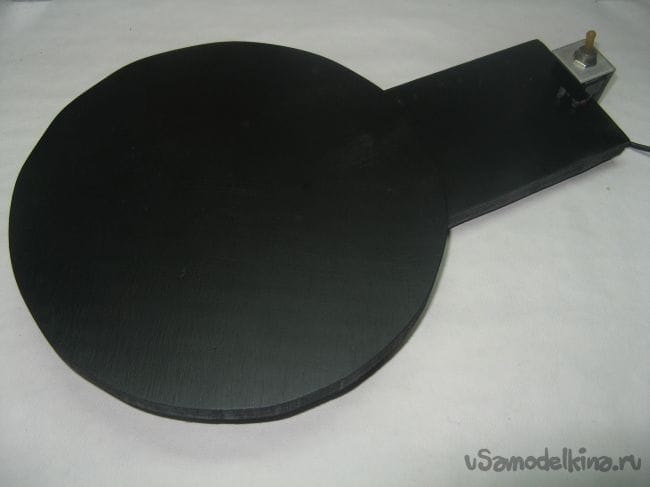 Так как фанера у меня БУ, я решил покрасить блин и основание стола с баллончика. Была в наличии матовая краска черного цвета. Все высохло быстро. Попутно просверлил отверстие для продевания проводов.