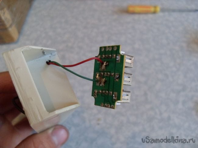 Далее продеваем провода через мелкое отверстие и припаиваем их к USB гнезду. Будьте внимательны, не перепутайте полярность!