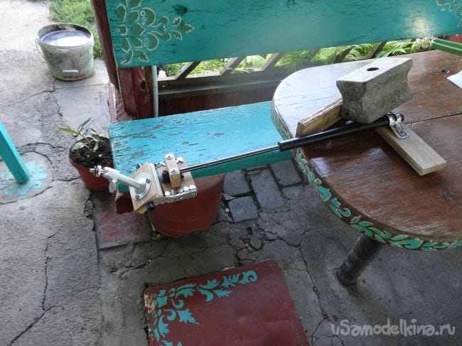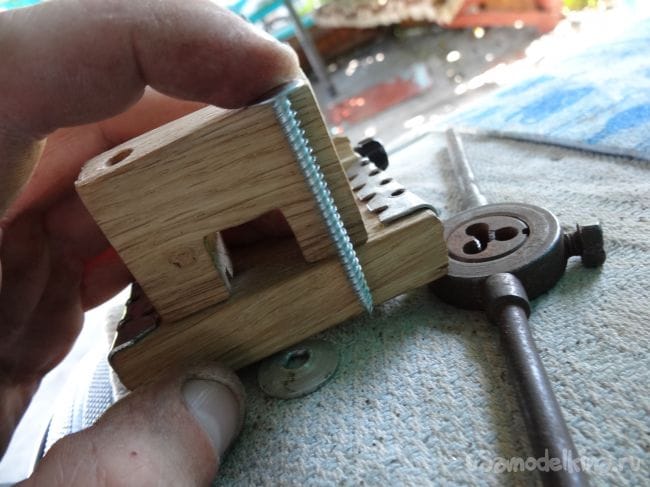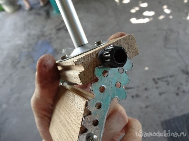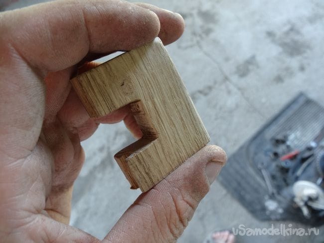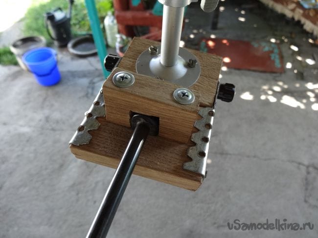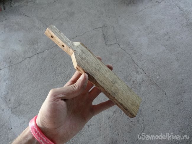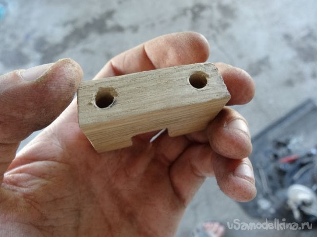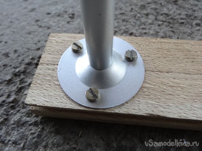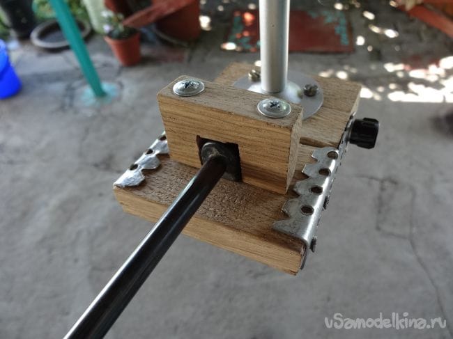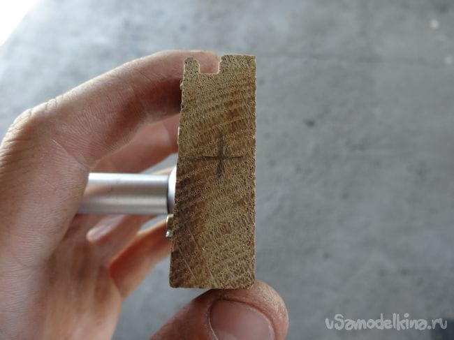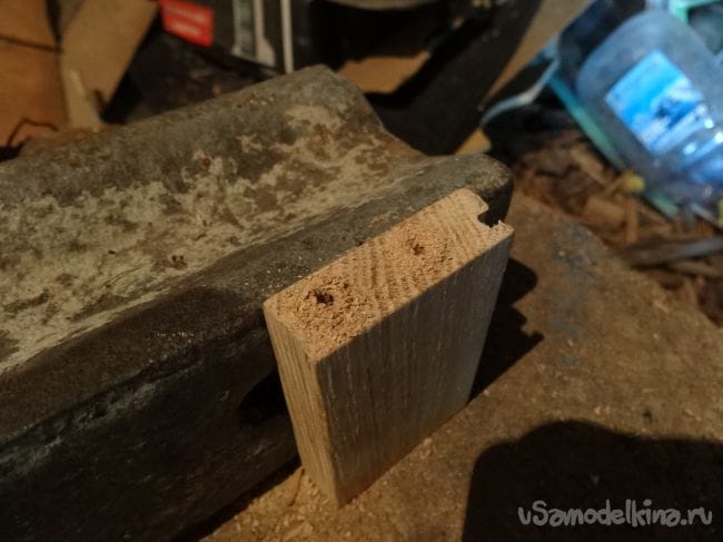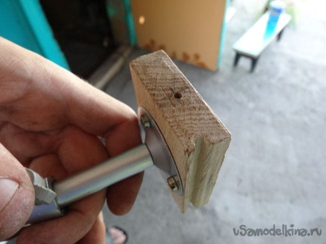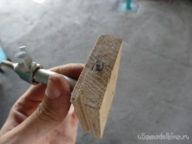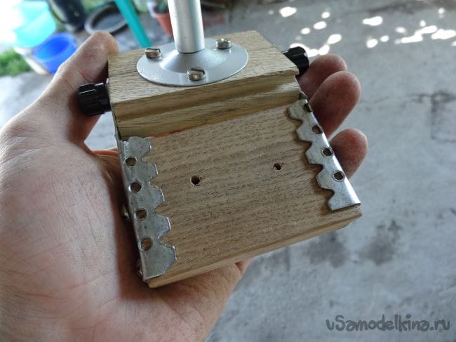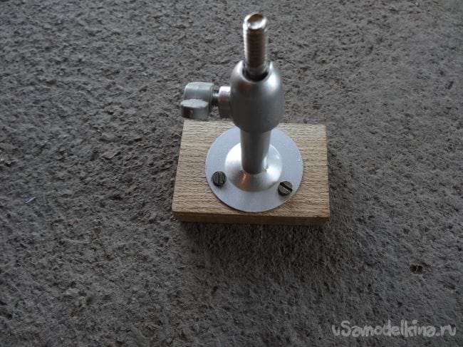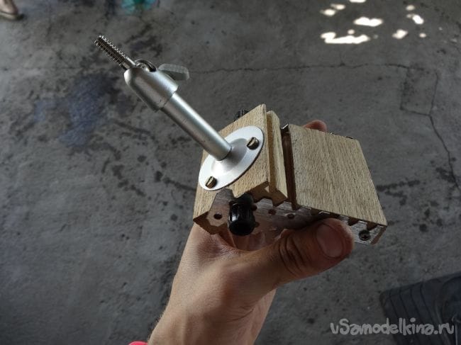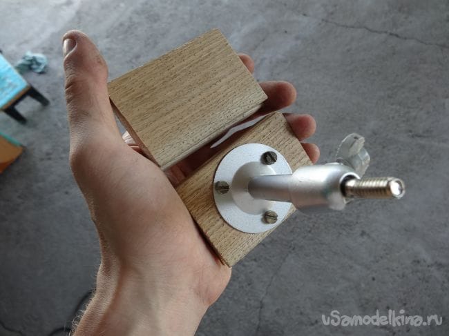 Чтобы держатель не перекашивался, я сделал упор из того же паркета, который прикрутил на болт М8 с края основания.