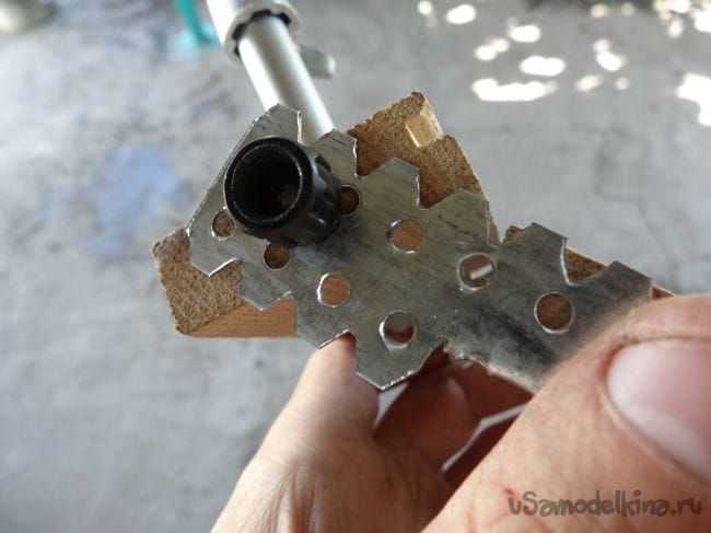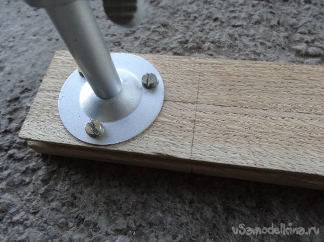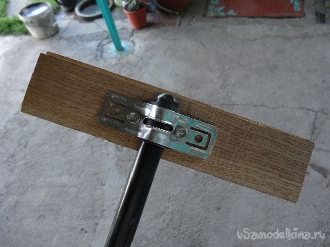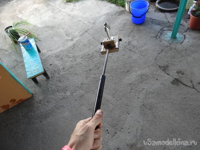 Если же у вас нет такого амортизатора, то можно удлинить держатель, например, при помощи телескопической удочки или же ровной доски. Чтобы закрепить амортизатор с подвижной частью держателя я выпилил крепление из паркета, которое повторяло форму штатного крепления амортизатора.
