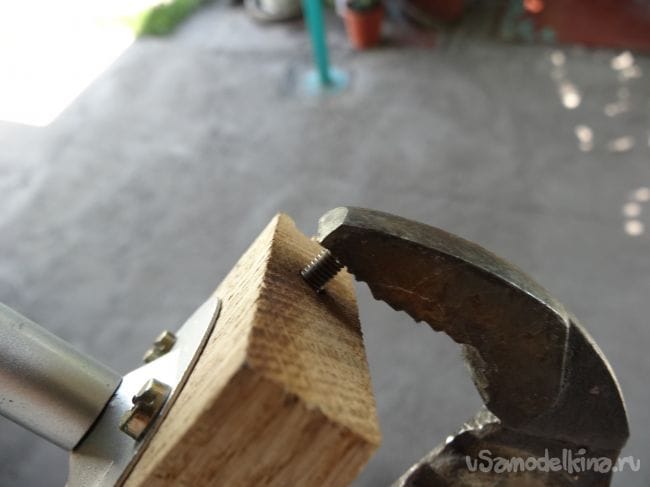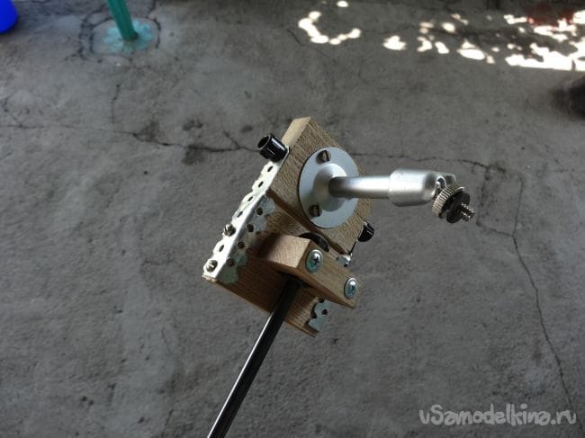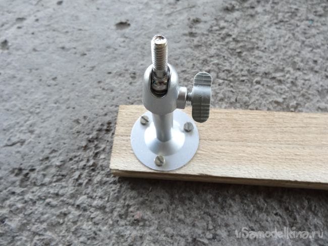На той части, где установлена головка для крепления фотоаппарата с двух сторон я просверлил отверстия строго по середине, а уже в них вклеил на эпоксидную смолу шпильки, которые я сделал из винтов М4, просто отпилив шляпку.