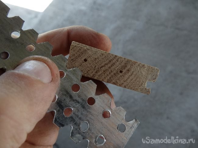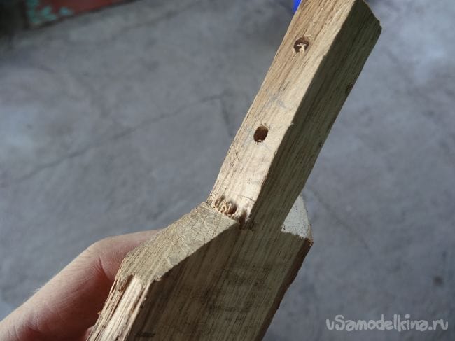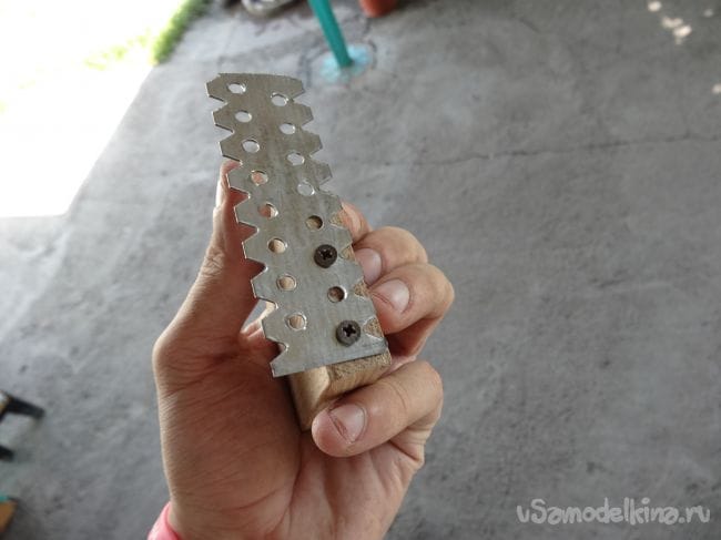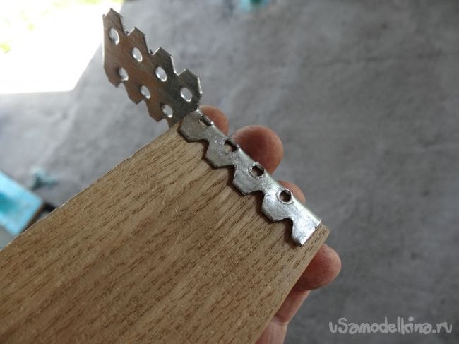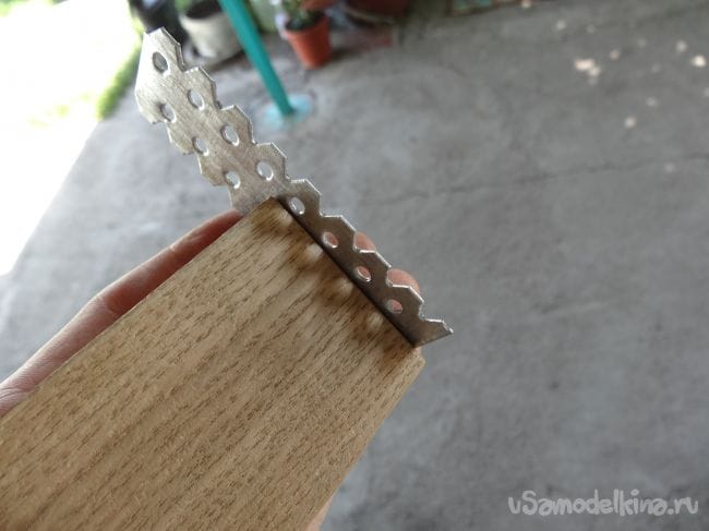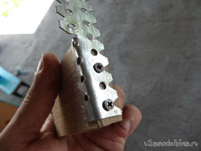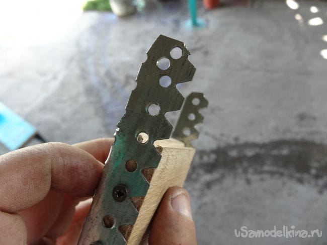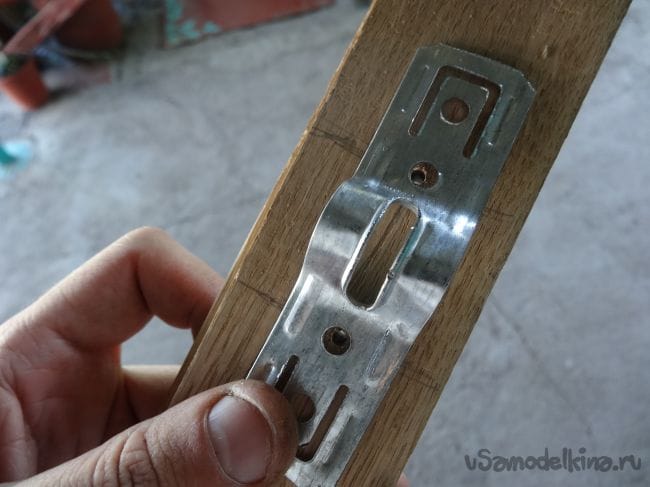 Второй отрезок с первым будет крепиться через подвес, в котором уже заранее проделаны отверстия. Их я прикрутил на два шурупчика с каждой стороны, предварительно просверлив в том месте маленькие отверстия, дабы не лопнула деревяшка.