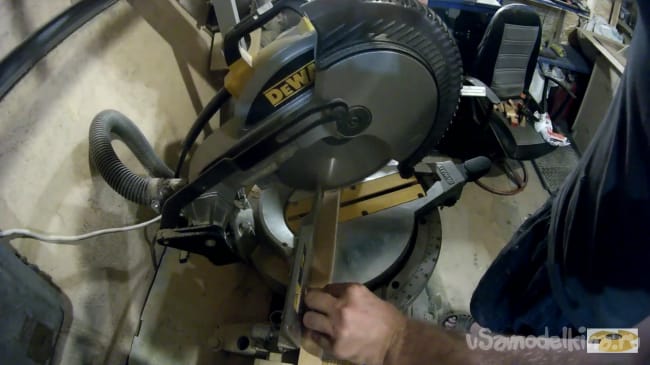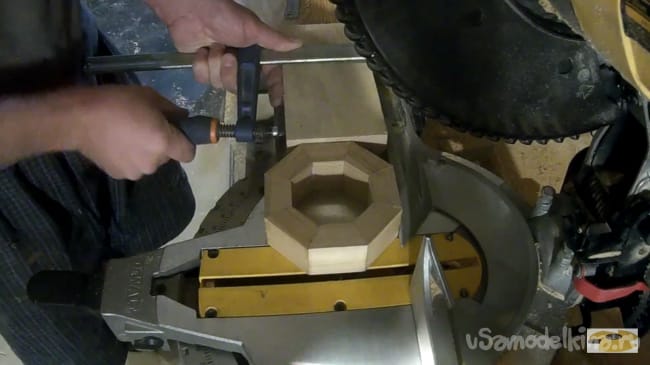 Составные части необходимо заранее рассчитать, угол спила будет зависеть от их количества и желаемого размера самой лампы. Для простоты берем 8 частей, на каждой из которой необходимо сделать спил под 45o с двух сторон, делается это проще всего на распиловочном станке.