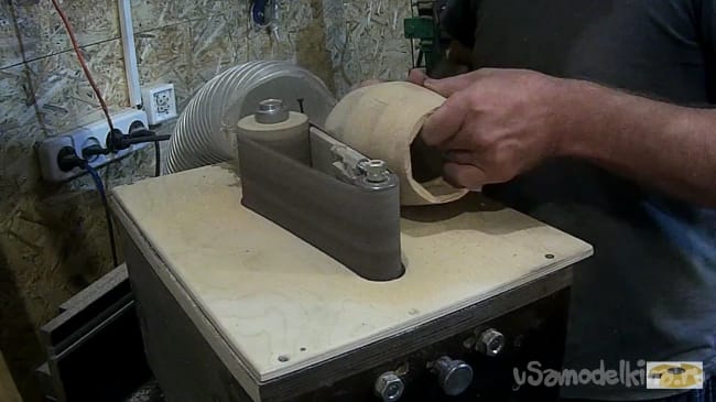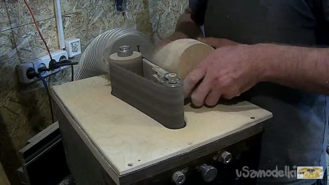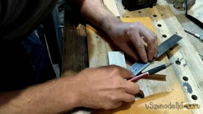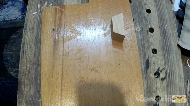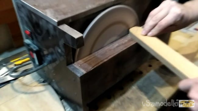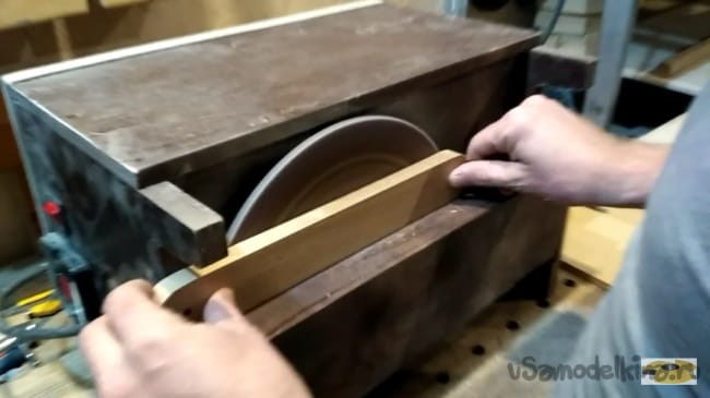 Отпиливаем четыре небольших доски из бука и на шлифовальном станке скругляем края, для этого лучше всего заранее начертить циркулем окружность.