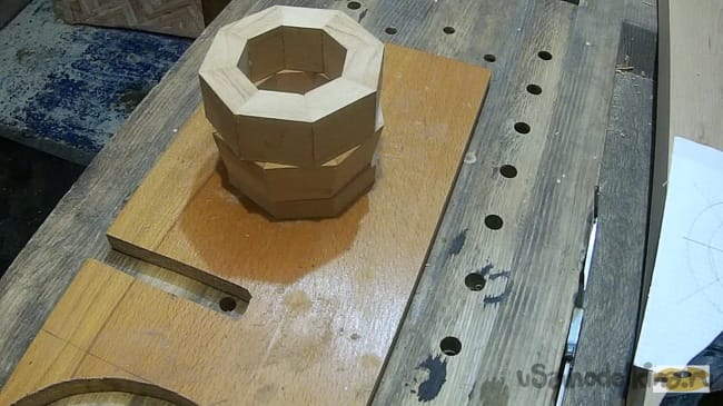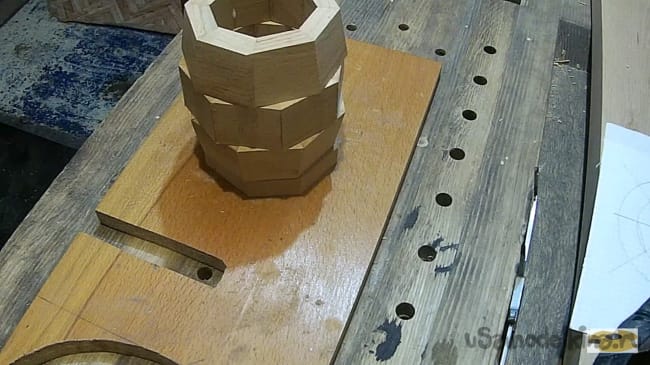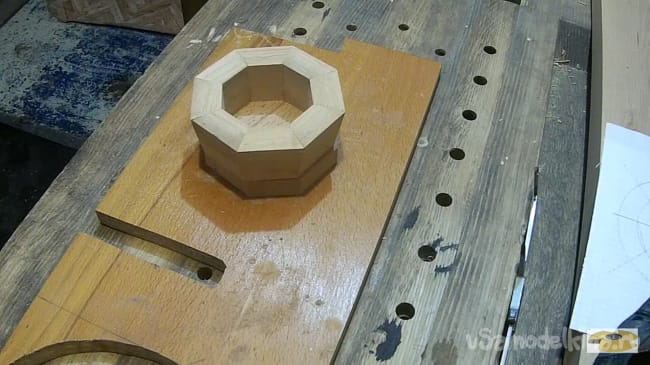 После высыхания всех четырех восьмиугольных заготовок необходимо сделать спил под углом на трех из них, чтобы создать форму лампы. Как это сделать более наглядно видно на фото. Также нужно сделать восьмиугольное донышко.