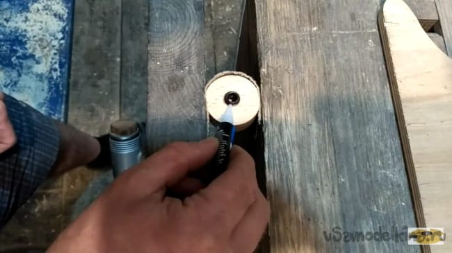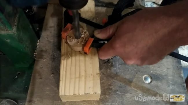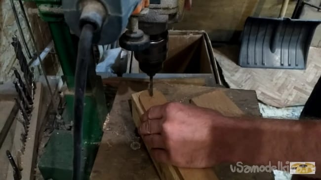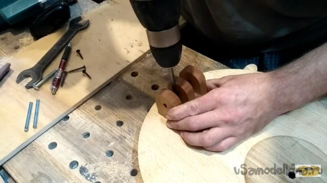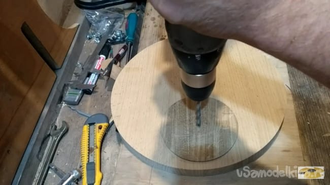 В центре этой окружности сверлим отверстие, делаем это с двух сторон и на каждой из досок.