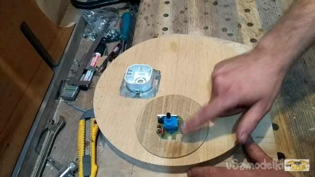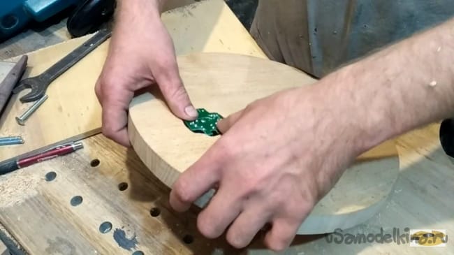 Клей высох, дубовый кружок приклеился, а значит переходим к установке диммера. Разбираем его корпус, нам понадобится сама внутрянка, сверлим отверстие в дубовом кружке и размечаем с обратной стороны размеры платы, после чего в при помощи ручного фрезера убираем излишки материала для посадки диммера вовнутрь.