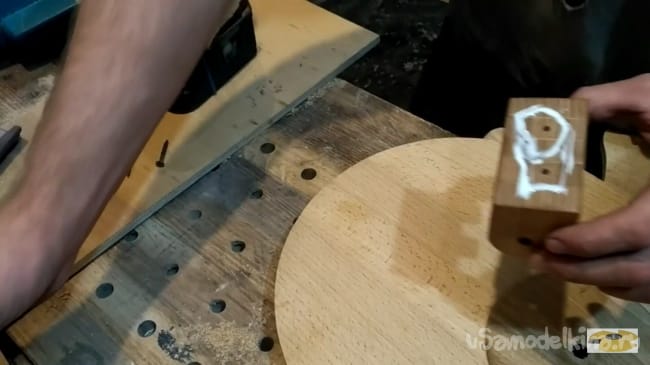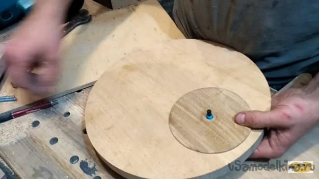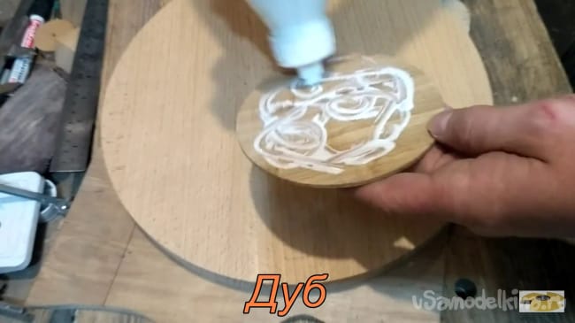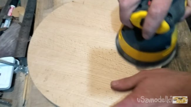 Поверхность шлифуем шлифовальной машинкой и поверх из дубовой тонкой дощечки приклеиваем круг диаметром поменьше.