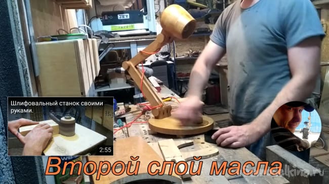 Собираем всю электрику, устанавливаем цоколь в голову лампы и в завершении наносим финишный слой масла для мебели на готовое изделие.
