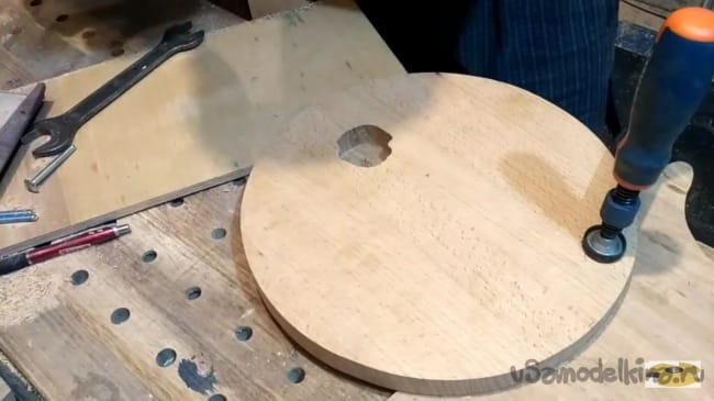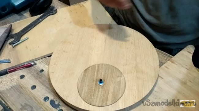 Теперь нужно сделать щит или так называемое основание, на котором будет закреплена сама ножка лампы. Форма ее также круглая, сделанная при помощи шлифовального станка.