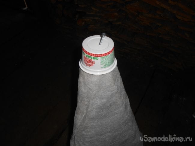 8 Шаг. На верхушку кладем баночку от сметаны или дно от пластиковой бутылки, приделываем на шуруп.