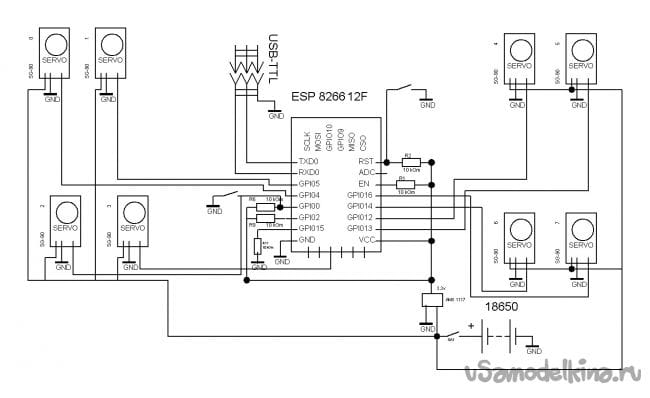 И тут возможны несколько вариантов. На мой взгляд, самый оптимальный использовать ESP 8266 - 12E в качестве контроллера. Во первых у него есть необходимое количество выводов для подключения всех сервоприводов. Во вторых встроенный Wi-Fi модуль, что очень облегчает процесс управления и соединения. В третьих можно легко программировать в среде Arduino IDE. Лучше всего выбирать модуль с 4 Mb памяти. Итак, для запуска и прошивки ESP-8266 надо сделать минимальную обвязку. Напрямую к питанию подключается только вывод VCC, остальные выводы: CH_PD, RESET, GPIO0, GPIO2, должны быть подтянуты к питанию (VCC) через резистор. Резисторы на 10kOm можно заменить на другие, от 4,7kOm до 50kOm, кроме GPIO15 — его номинал должен быть до 10k. Напрямую, к минусу (GND) питания подключаем только GND, а GPIO0 подтягиваем тоже через резистор до 10kOm, для перевода модуля в режим загрузки прошивки, к GND. Не забудьте добавить кнопку для перезагрузки и вывести разъем для подключения USB-TTL, для осуществления прошивки. У всех сервоприводов подрезаем провода так, чтобы не мешались и не болтались, но при этом достаточно свободно, для того чтобы ноги могли спокойно двигаться. Все красные провода от сервоприводов соединяем напрямую с плюсом аккумуляторов, коричневые – с минусом. Оранжевые провода припаиваем к ESP согласно схеме: