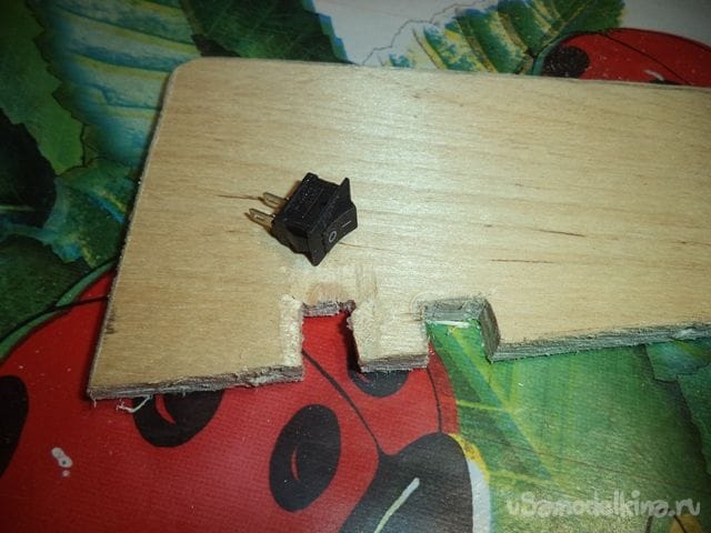 Одну ножку еще не крепим, так как на ней будут расположены разъем для подключения к питанию и выключатель. Поэтому для выключателя и разъема выпиливаем углубления с помощью ручного лобзика.