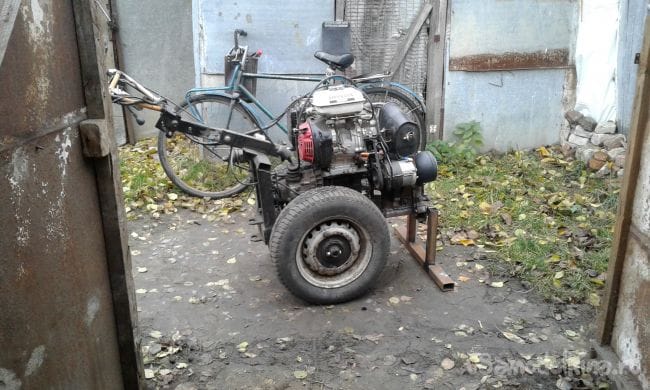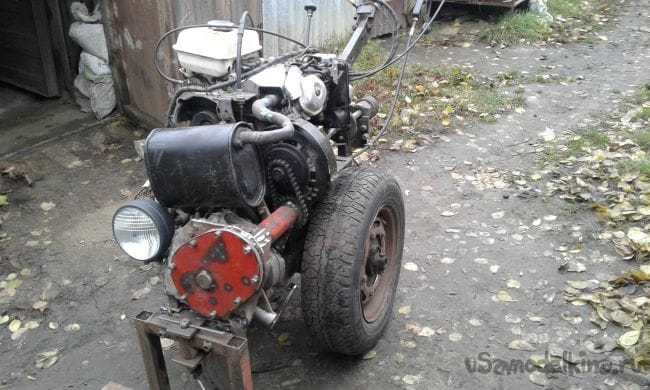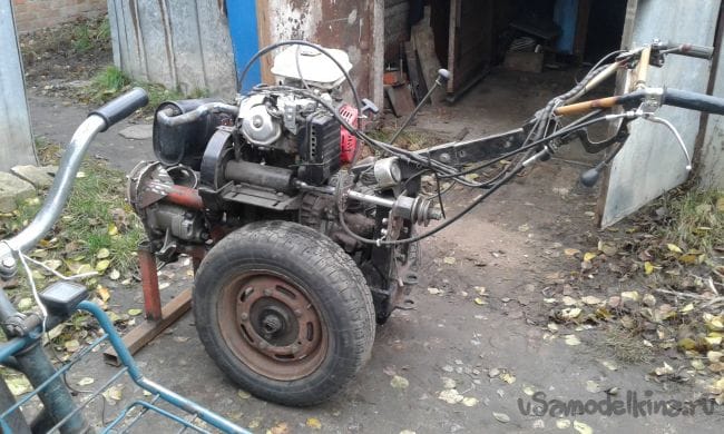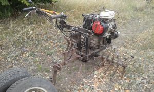 Конструирую мотоблоки много лет. Это новая разработка с четырехтактным двигателем и двумя коробками _ от мт10 и ваз01. Имеем 16 передач вперед и 4 назад, перекрывается весь диапазон сельхоз и транспортных работ. Кто имеет покупной мотоблок, тот поймет в чем проблема.