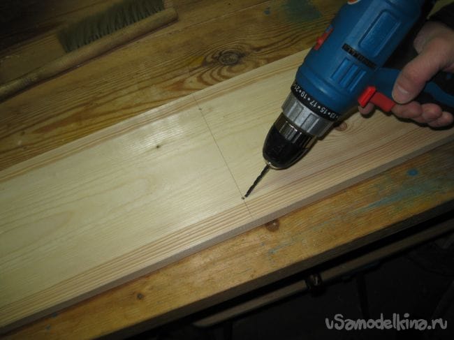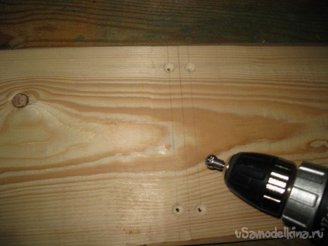 Производим разметку доски шириной 20 см, и сверлим в ней отверстия под шурупы диаметром 4 мм.