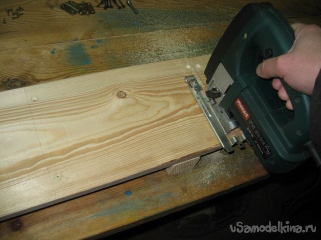 Распиливаем нашу доску электролобзиком на четыре заготовки для стенок ящика.
