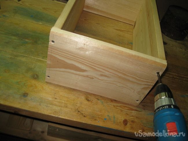 Собираем каркас нашего ящика на шурупах по дереву длиной 60 мм. Используем для этого шуруповерт.