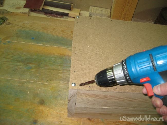 Прибиваем оставшийся кусок оргалита к рамке крышки, предварительно замерив ее диагонали.
