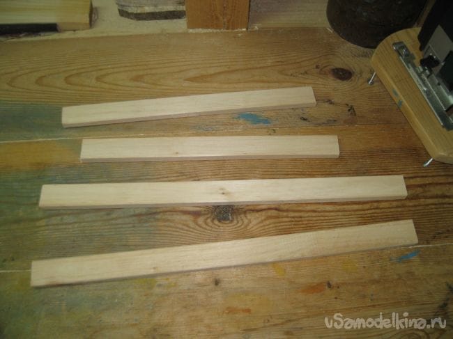 Распиливаем деревянные планки на четыре заготовки необходимого размера.