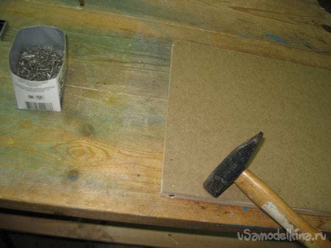 Прибиваем один из кусков оргалита, мелкими гвоздиками к нижней части каркаса ящика, предварительно промерив рулеткой диагонали ящика.