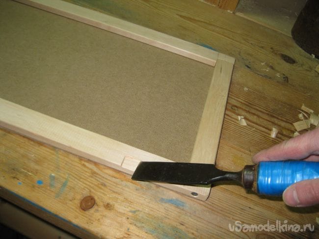 Размечаем на стенке ящика места для установки петель и вырезаем под них углубления при помощи стамески и молотка.