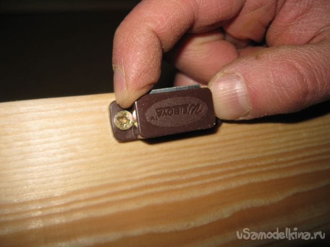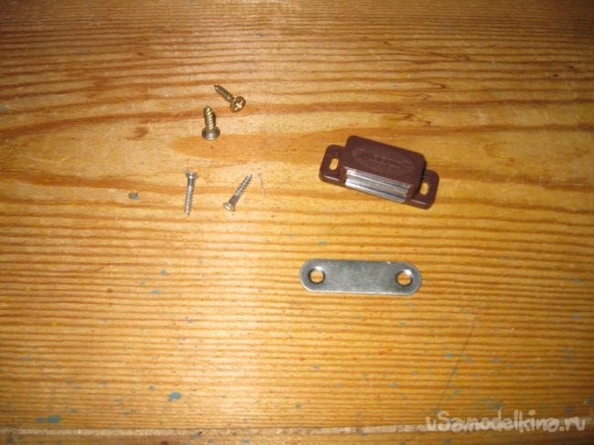 Устанавливаем на верхнюю часть передней стенки ящика сам мебельный магнит, также прикручивая его мелкими шурупами.