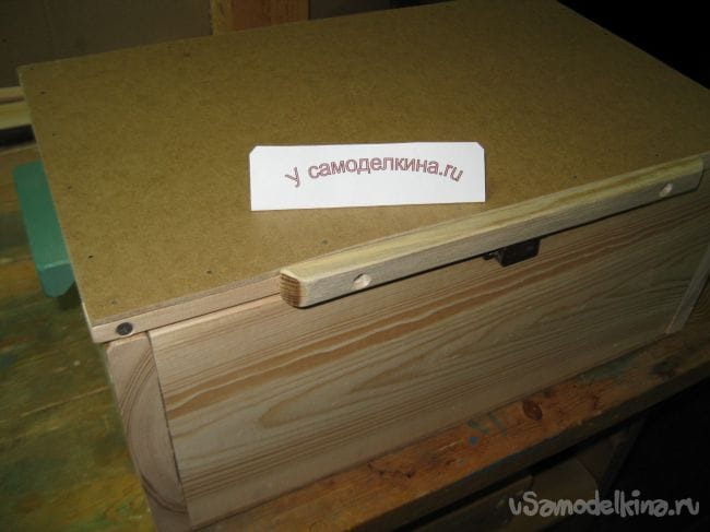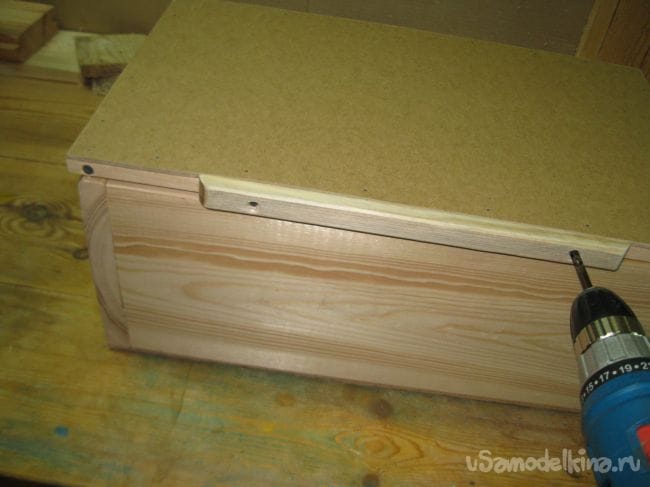 Кроме того, нужно сделать какую-нибудь ручку для крышки ящика, чтобы ее удобно было открывать. Для этого я также подобрал уже готовую планку, которая осталась у меня от выпиливания какой-то прежней самоделки.