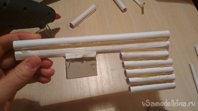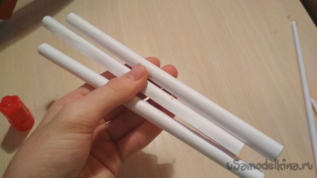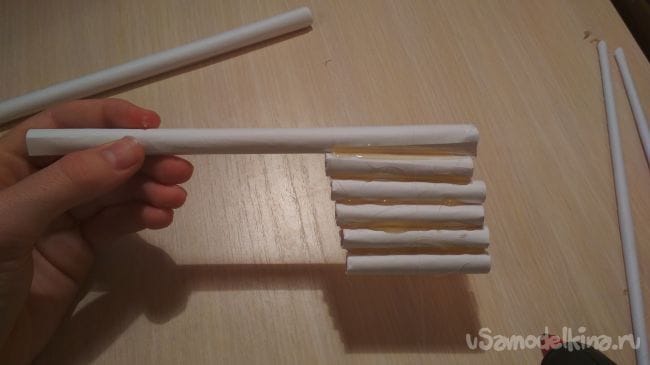 Берём пять отрезков от толстых трубочек и приклеиваем их к нашей прошлой заготовке так как показано на фото: