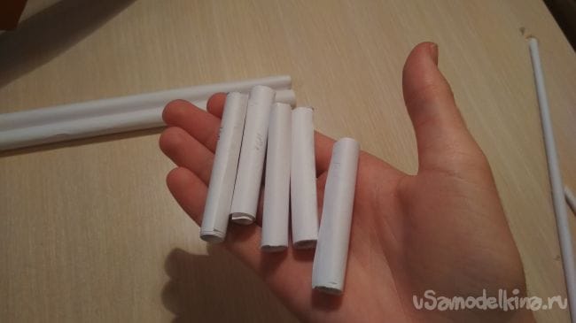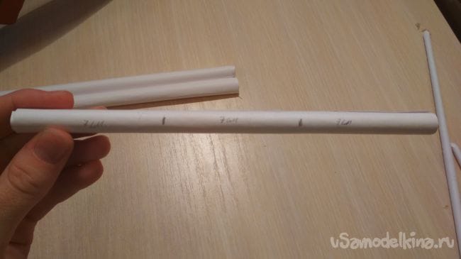 Берём 2 толстые трубочки и размечаем их на части по 7 см, затем отрезаем:
