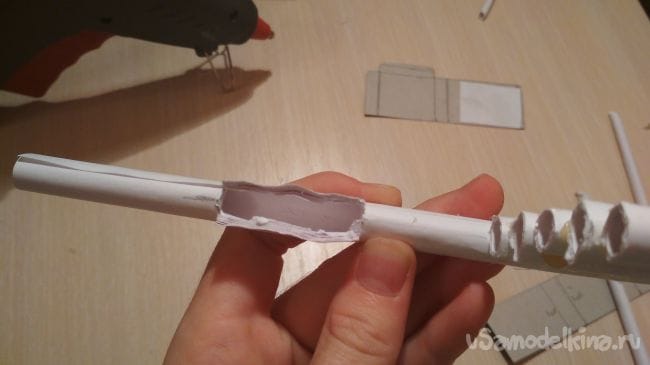 Укорачиваем нашу заготовку по отношению к пистолету так, чтобы при нахождении в толстой трубочки с магазином она полностью перекрывала отверстие для магазина, вообщем так как показано на фото ниже. Затем вставляем ее в наше "дуло"