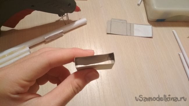 Берём ту трубочку которую делали по толще и немного зажимаем и склеиваем низ, так как показано на фото. Также важно чтобы через это отверстие с небольшим сопротивлением проходила тонкая трубочка. Края трубочки можно прокапать супер клеем для укрепления материала.