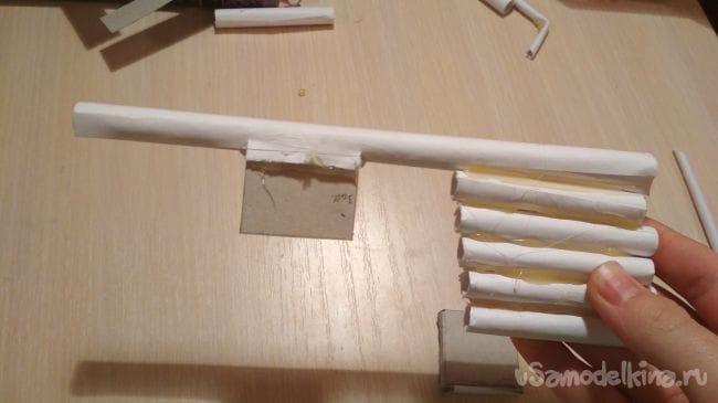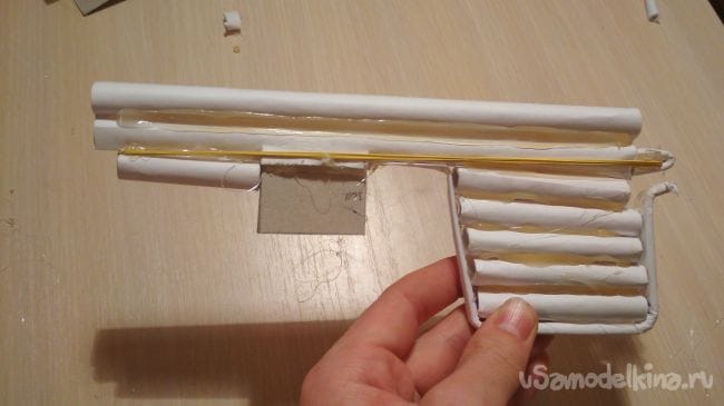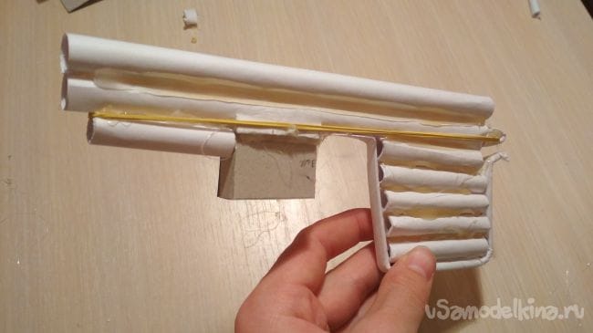 Затем берём маленькие резинки и оставшуюся заготовку из картона. Заготовку из картона вставляем в магазин и закрепляем резинками так как показано на фото: