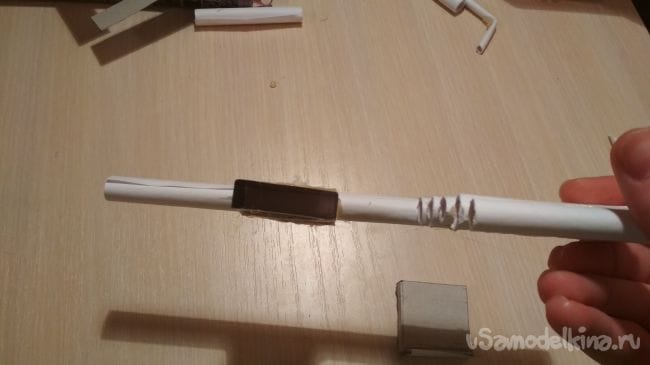 Вставляем и приклеиваем к отверстию на пистолете ту заготовку у которой два одинаковых отверстия с двух сторон, приклеить нужно так, чтобы в толстой трубочке свободно двигалась тонкая ни чего не задевая, если вы что-то не так сделаете то ни чего не получится (у меня получилось не с первого раза)