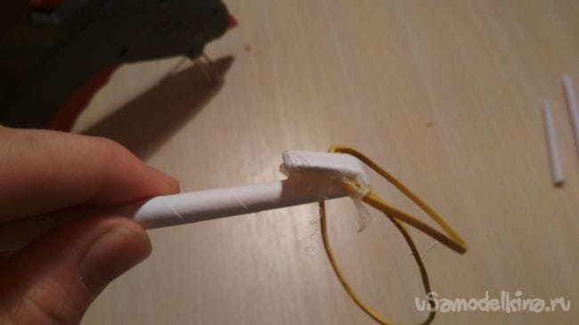 Берём тонкую трубочку и обрезаем ей концы примерно по 4 см с каждой стороны, затем загибаем один край на 1,5 см, после чего надеваем на изгиб две денежные резинки и как можно крепче приклеиваем так как показано на фото, для крепкости можно также подматать скетчем или изолентой: