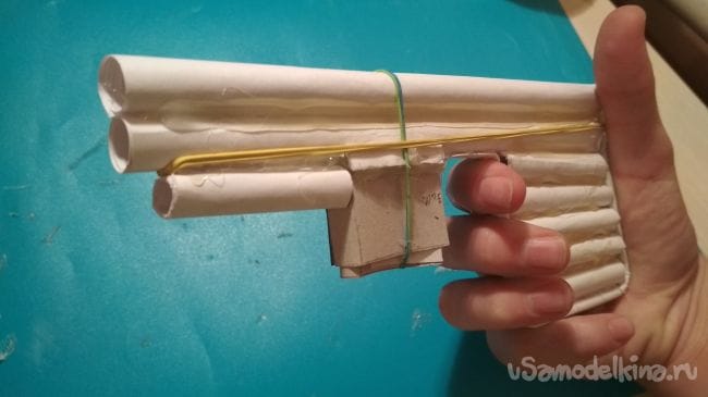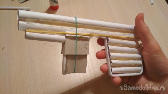 Ну вот и все! Наш многозарядный пистолет готов и осталось его только протестировать. Для этого просто нужно рукой натянуть назад тонкую трубочку с резинками до того момента пока снаряд не попадет в "дуло" вы это поймёте по смещению давящей картонной детали в "магазине" в сторону "дула", таким образом происходит перезаряжание, целимся и стреляем. Затем просто снова натягиваем трубочку и снова стреляем, так можно делать до того момента пока в магазине не кончатся снаряды.