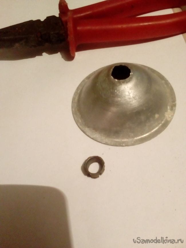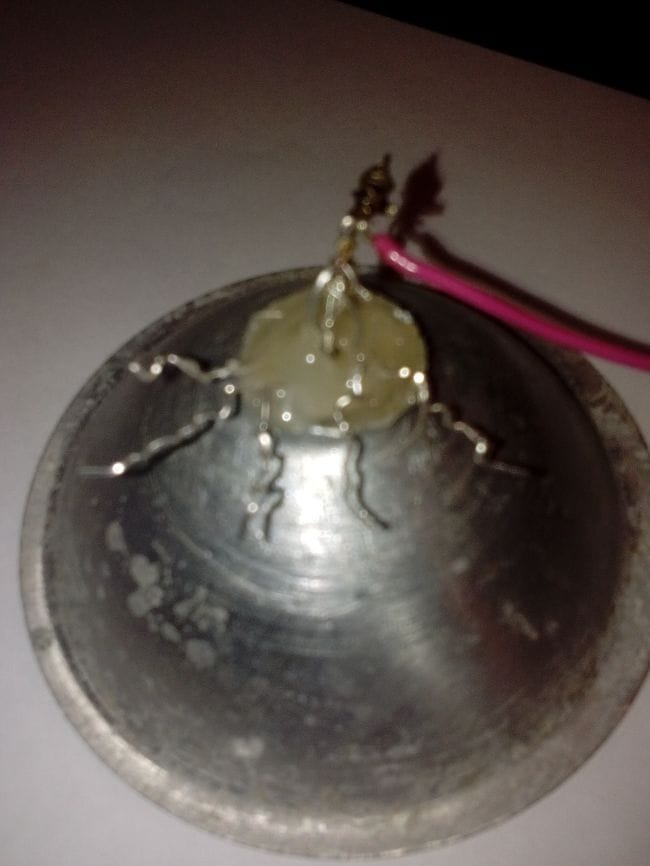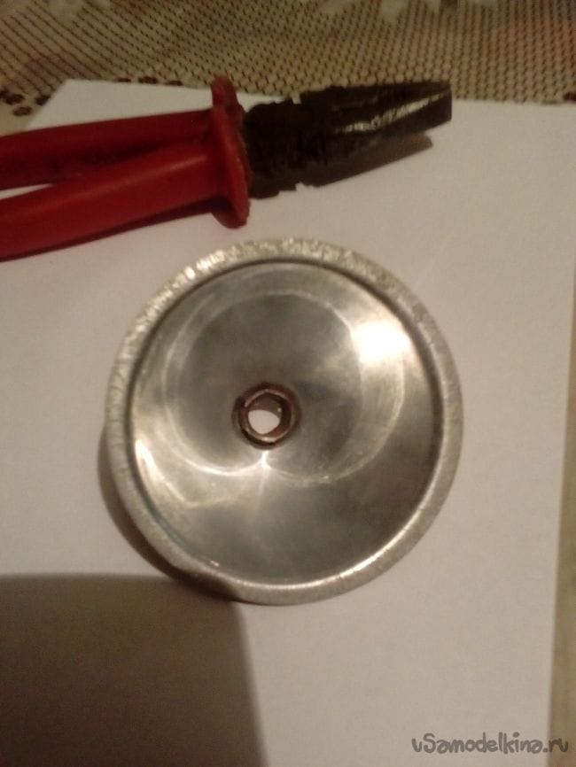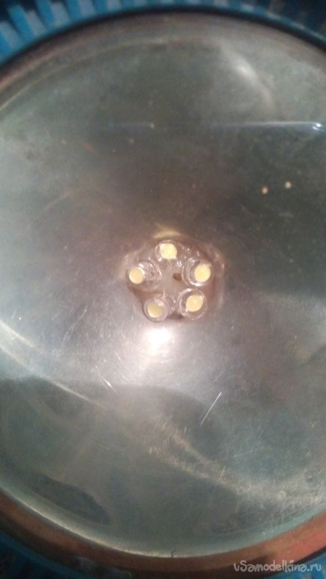 Далее мне понадобились плоскогубцы и горячий клей. С помощью плоскогубцев я расковырял диаметр отверстия в отражателе на столько, что туда зашло 5 светодиодов. Катоды или аноды нужно скрутить вместе, а другие 5 выводов оставить, в итоге к каждому светодиоду можно подключить по 1 резистору, как это требуют правила.