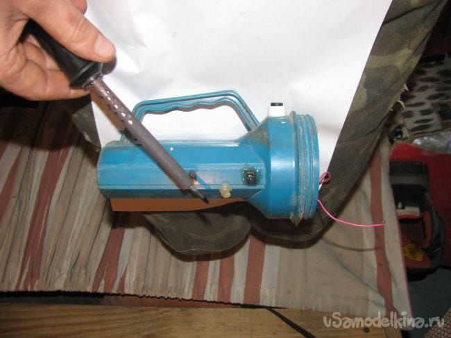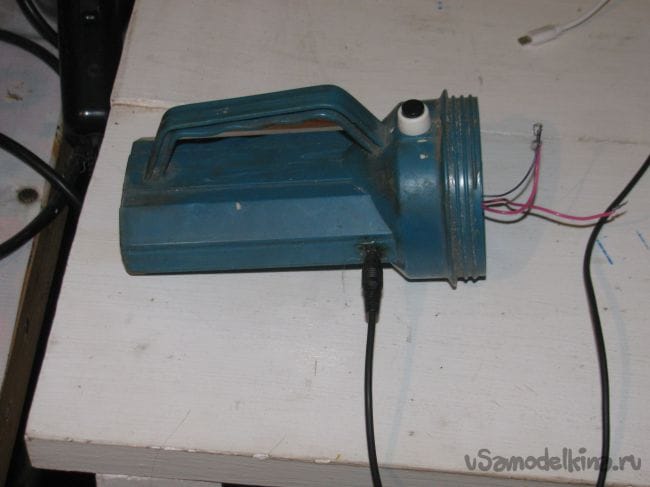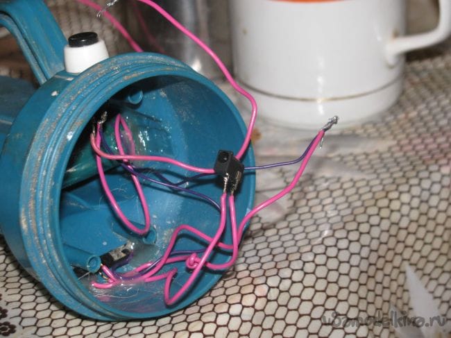 Первым делом разбираем фонарь и выкидываем из него все лишнее. Это был не аккумуляторный фонарь, а на обычных батарейках. Я вытащил также патрон лампочки накаливания с отражателя и убрал родной переключатель.