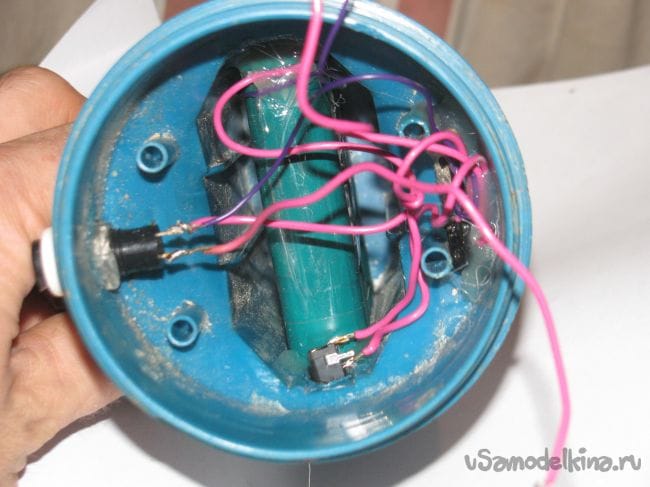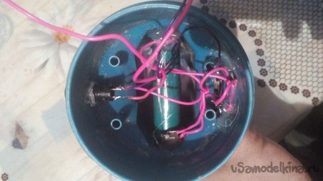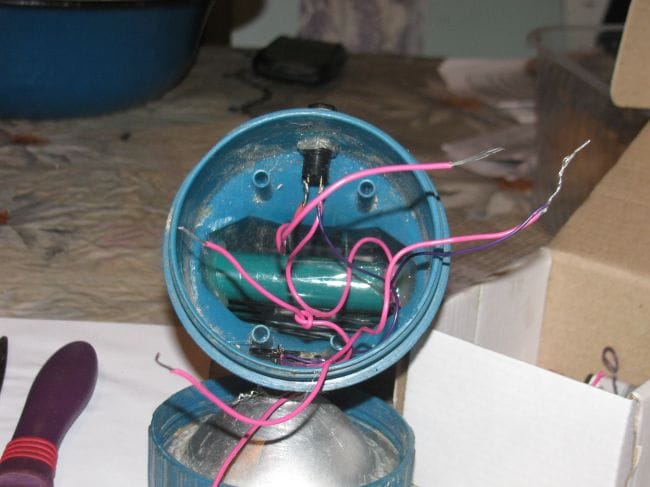 В разрыв светодиодам подключаем выключатель. Не забывайте выключать фонарь при зарядке. Так как аккумуляторы у меня не такие, как нужно, они перезаряжаются, но на 18650 никаких проблем возникнуть не должно.