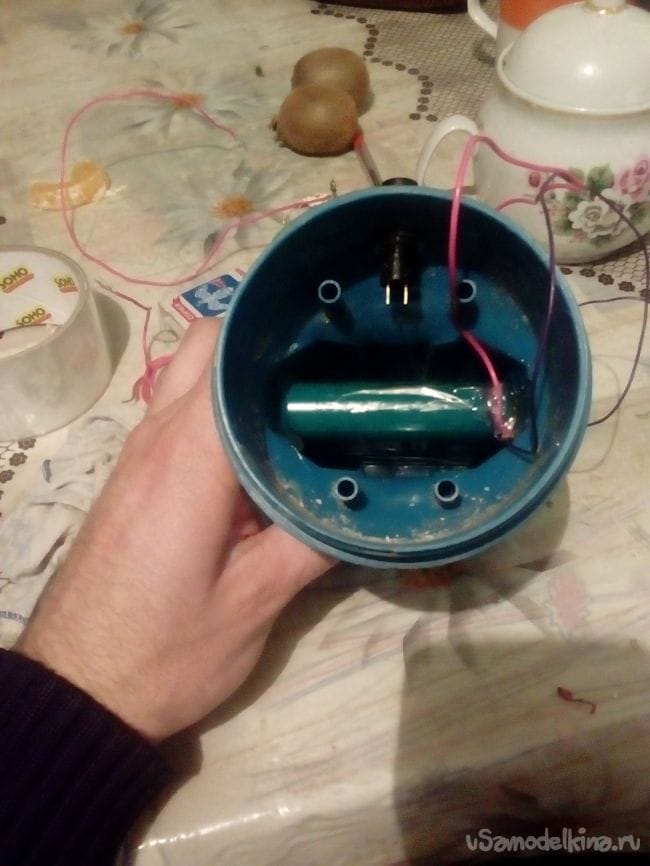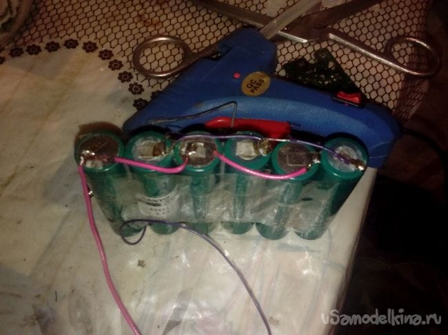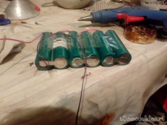 Спаиваем все плюсы и все минусы, тем самым делая емкость АКБ общей. Вставляем АКБ в корпус и фиксируем горячим клеем.