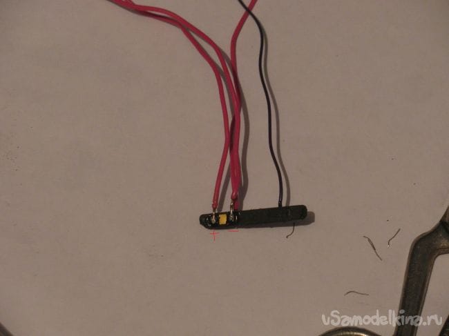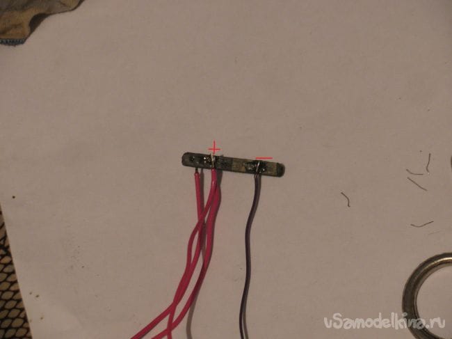 Также припаяйте два провода к контактам батарейки для подачи напряжения. Центральный нам не нужен, это датчик температуры.
