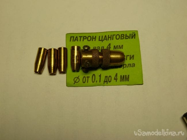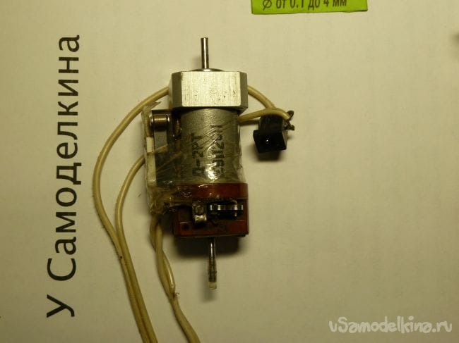 Лишнего мудрить не хотелось и концевик соединил с моторчиком скотчем. Подпаял провода моторчик--концевик--блок питания. Затем установил цанговый патрон.