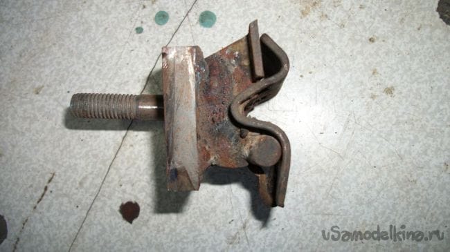 Для изготовления вкладыша отрезал от вышедшего из строя штатного домкрата пятку. Из 8мм железа вырезал прямоугольник и просверлил его. В отверстие вставил и прихватил сваркой болт М12 подходящей длинны а сверху приварил пятку.