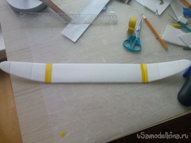 Теперь заранее приготовленный нами прямоугольник 5 на 2 см. также "пронзаем" и прилепляем к крыльям. После этого крылья "нанизываем" на фюзеляжную балку.