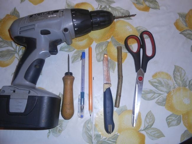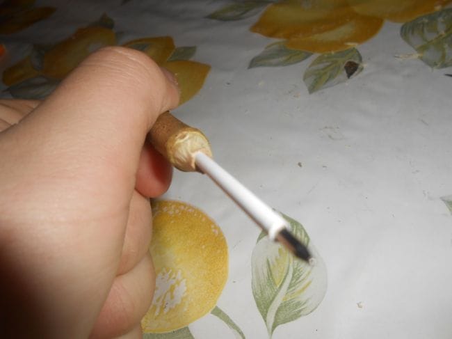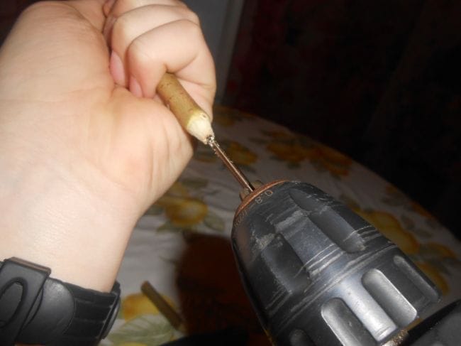 2.Шаг . Начинаем сверлить дыру под стержень от шариковой ручки . Для этого берем шило и прокалываем по центру , а потом начинаем сверлить дыру . Как показано на фотке .