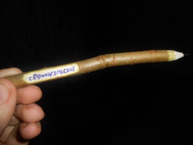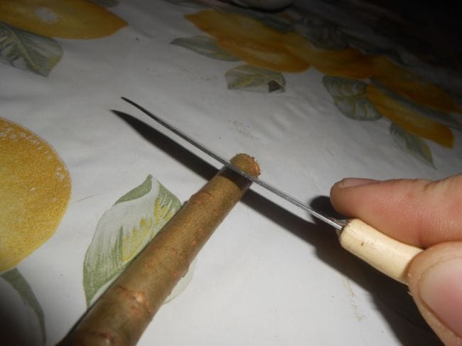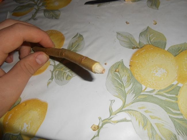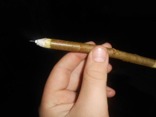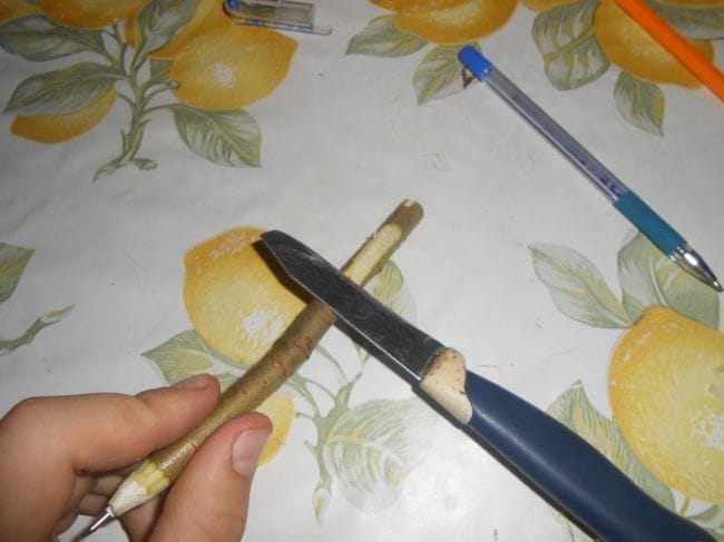 1.Шаг . Заостряем конец веточки так чтобы было как у обычной ручки . Как показано на фото .