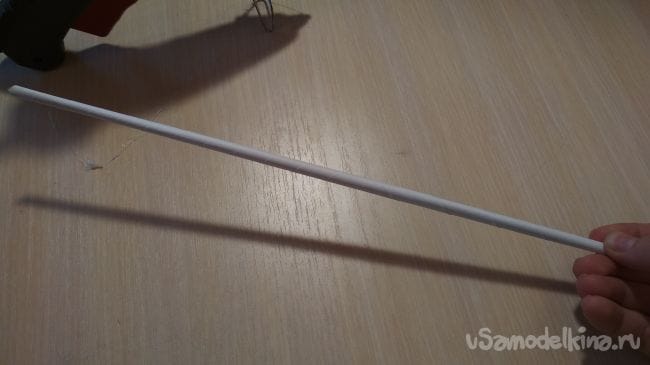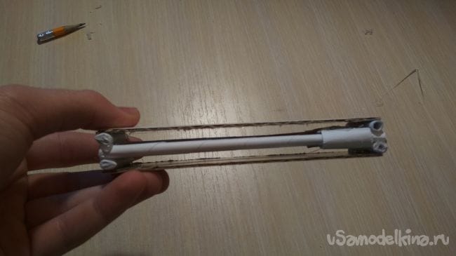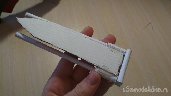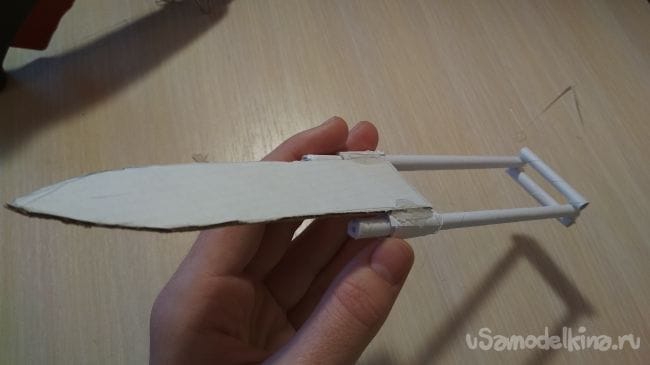 Половинки тонкой трубочки кладем параллельно друг к другу на расстоянии 2,6 см друг от друга, затем берём 3-х сантиметровые отрезки тонкой трубочки и две из них приклеиваем на один конец с разных сторон длинных трубочек, после чего с другой стороны нашей заготовки нужно надеть по одному отрезку толстой трубочки на половинки тонкой трубочки. Теперь просто приклеиваем к толстым отрезкам наш клинок так как показано на фото (проверьте чтобы клинок мог свободно двигаться в перёд назад, как по рельсам)