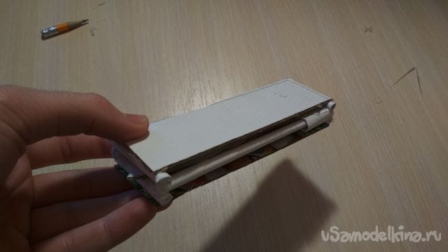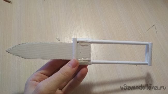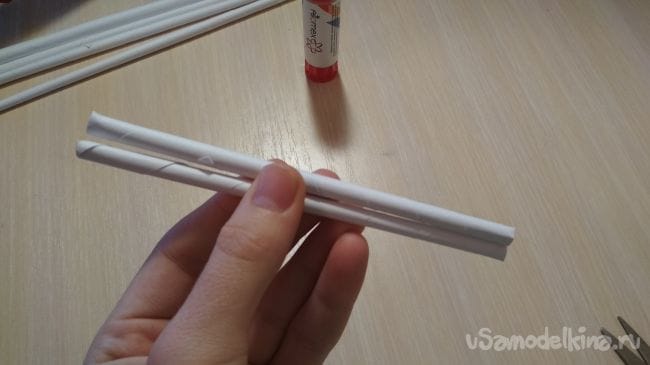 Возьмём оставшиеся 3-х сантиметровые отрезки трубочки и приклеим их так как показано на фото (наш клинок должен быть между ними)