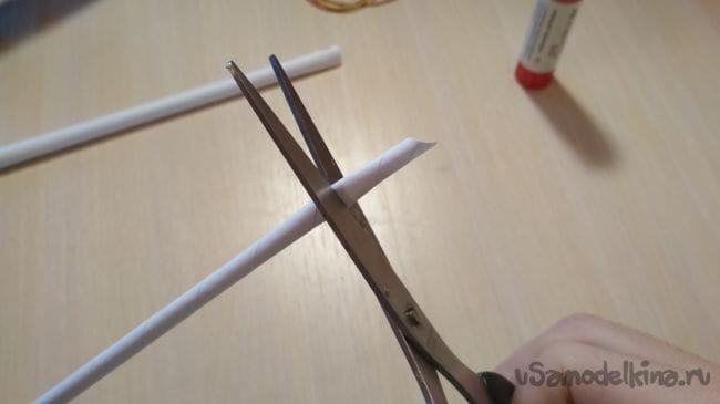 Теперь берём одну тонкую трубочку и разрезаем её ровно по полам: